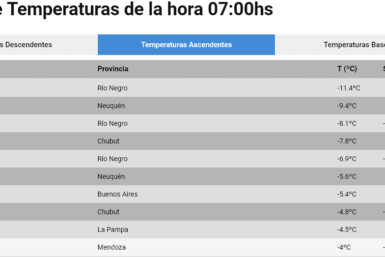 El primer puesto entre las ciudades bajo cero, según el informe de las 7h, fue Maquinchao con 11.4 grados bajo cero, la siguió Chapelco con 9.4 grados bajo cero y luego Bariloche con 8.1 grados bajo cero y una sensación térmica de 12 grados bajo cero. Los cincos primeros puestos los completas dos patagónicas: Esquel con 7.8 y San Antonio Oeste con 6.9 grados bajo cero.