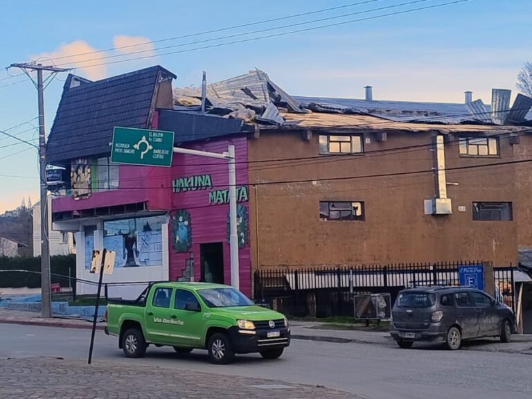 Las intensas ráfagas registradas este domingo provocaron la voladura del techo de un salón de fiestas infantiles en El Ñireco. No hubo heridos, aunque sí importantes daños materiales.